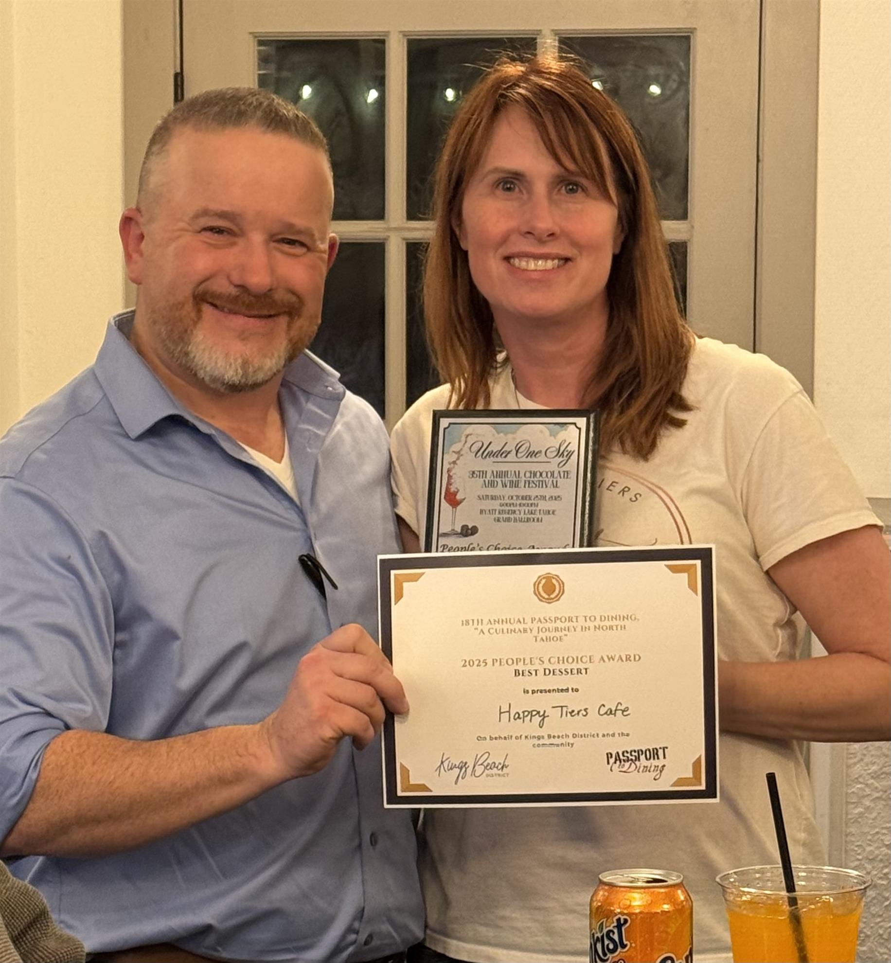 The members sampled soups, salads, and sandwiches from the new lunch menu. Happy Tiers is opening a King's Beach location. To the right, owners and members Andrea and Jason show off their people's choice award.